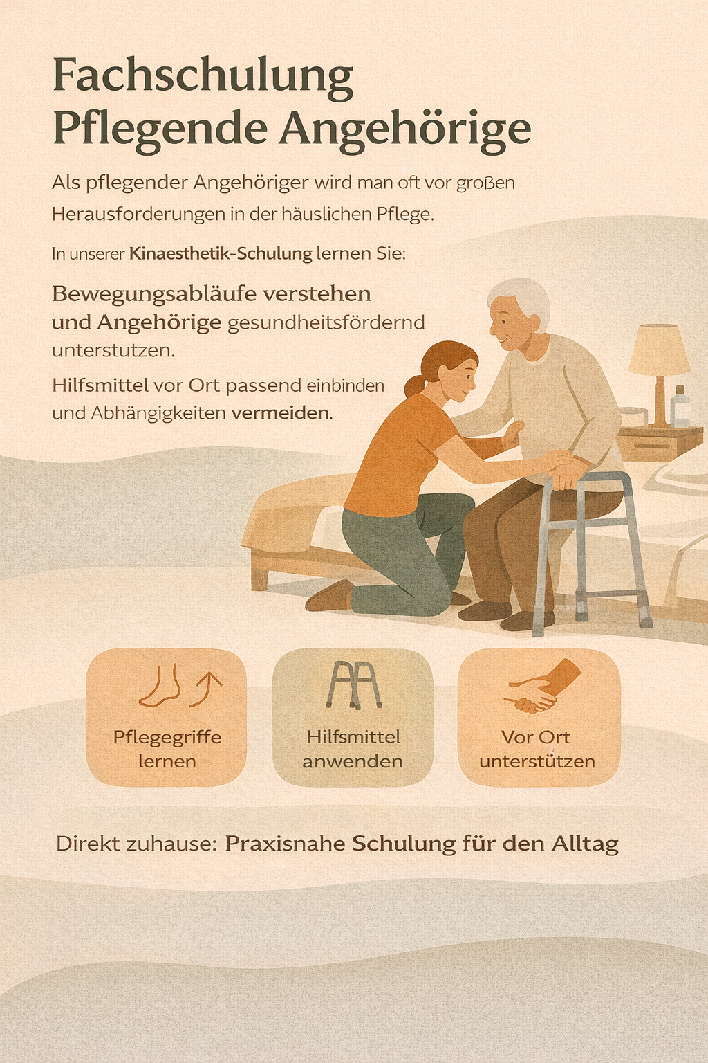 Mit dem Ansatz der Kinaesthetik werden Sie so geschult, Bewegungsabläufe zu verstehen. Dadurch lernen Sie auch, wo und wie Sie Ihren Angehörigen unterstützen können.